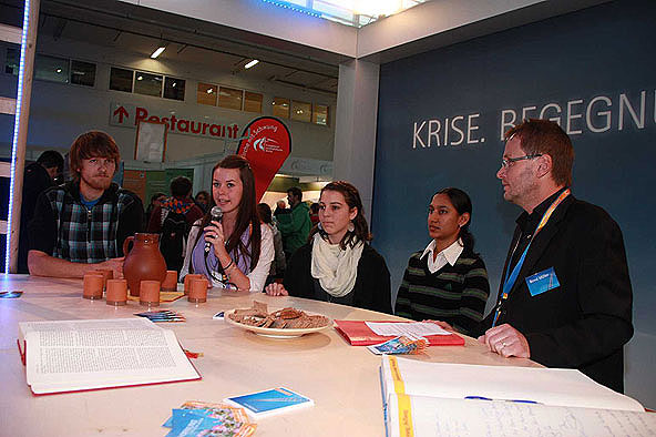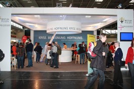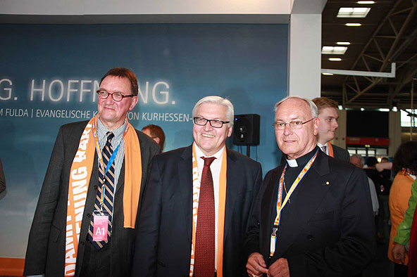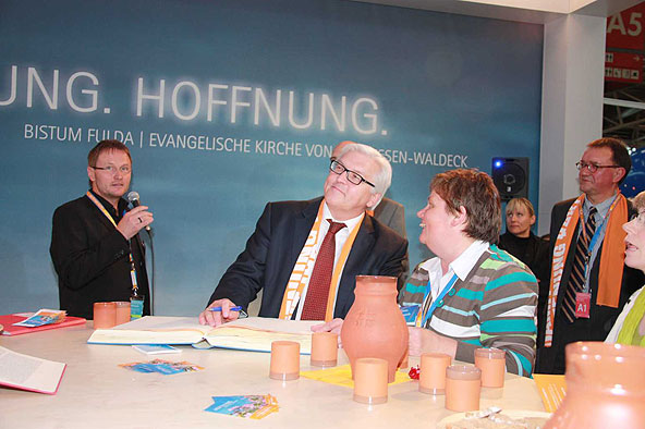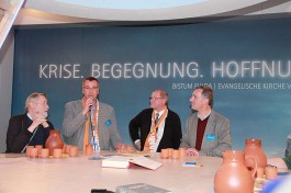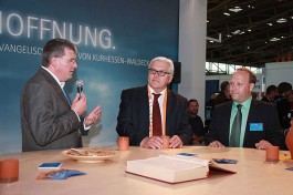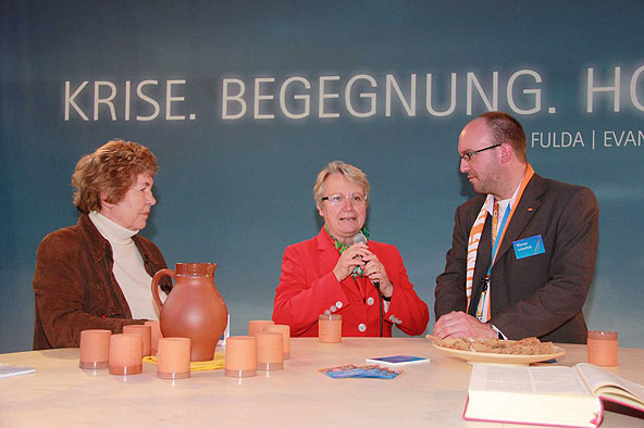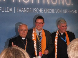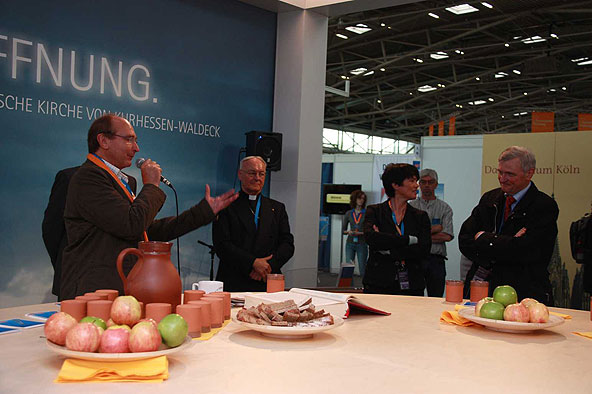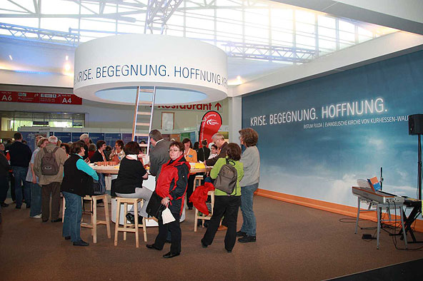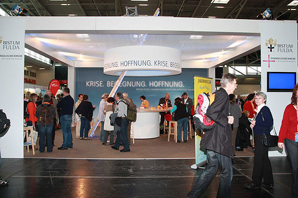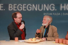 Von zahlreichen angenehm überraschten Standbesuchern weiß der Ökumenereferent des Bistums Fulda, Dr. Joachim Negel, zu berichten. „Die Leute finden es gut, dass die evangelische und die katholische Kirche miteinander sprechen. Deutlich wird, dass die Menschen von einem Krisengefühl erfasst worden sind und dass für viele die Kirche, die immer wie ein „Fels in der Brandung“ stand, nicht mehr so wie früher Anhaltspunkt für ihr Leben ist.“ sagte Prof. Dr. Joachim Negel, Marburg. Die Bedeutung des Standes liege, so der Ökumenereferent, vor allem auch in seiner Wirkung nach innen. „Ich bin der Meinung, dass der Stand für das Miteinander des Bistums und der Evangelischen Landeskirche ein wichtiges Zeichen ist. Damit ist er vielleicht sogar wichtiger, als sein Auftrag, beide Kirche in der Öffentlichkeit zu präsentieren.“ so Dr. Negel abschließend.