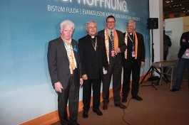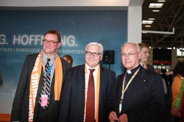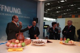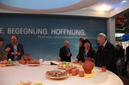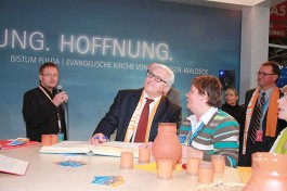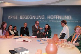 „Der Ökumenische Kirchentag ist ein Bild für die Vielfalt der Kirche“, sagte Bischof Algermissen bei seinem Besuch auf dem Stand. „Der große runde Tisch, um den sich die Gäste und Besucher des Kirchenstandes zusammenfinden, ist ein Bild dafür, dass wir miteinander ins Gespräch kommen müssen, um zueinander zu finden“, so der Fuldaer Oberhirte. Nur in ökumenischer Gemeinschaft werde es in Zukunft möglich sein, die Gesellschaft zu verändern. Die drängenden gesellschaftlichen Probleme, wie z. B. die ungelösten Fragen der Bioethik, bedürften einer gemeinsamen Antwort der Kirchen. „Wenn wir gespalten sind, sind wir nicht glaubwürdig“, führte der Bischof aus.