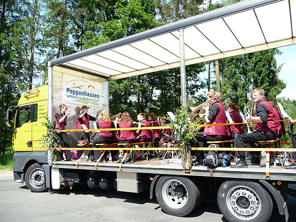 • Ein stattlicher Laster der Fa. A. Krenzer-Palettenbau mit dem Musikverein Cäcilia auf der Ladefläche unter Leitung von Manfred Münch