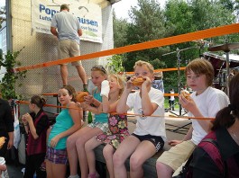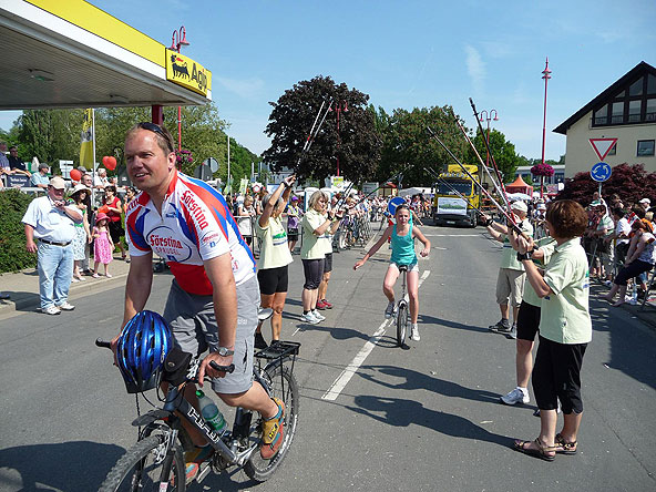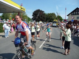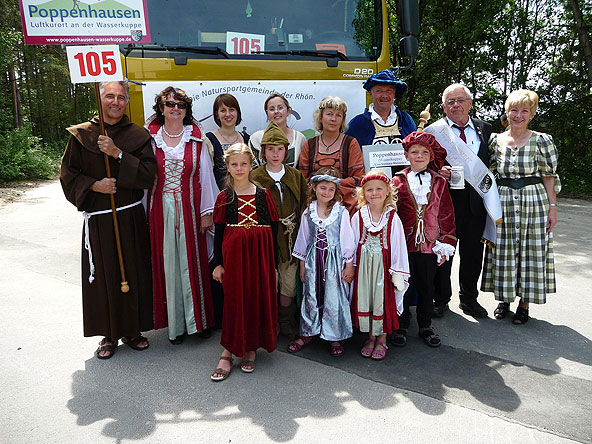 100609_Poppenhausen_011Poppenhausen. Zum größten Landesfest der Hessen hatte in diesem Jahr Stadtallendorf eingeladen. Die Teilnehmergruppe aus Poppenhausen wurde zum 10. Mal in zugelassen, um sich beim großen Festzug zum Abschluss der Festtage zu präsentieren. Wie im Vorjahr wurden wir von den Moderatoren angekündigt mit dem Motto: Luftkurortgemeinde Poppenhausen an der Wasserkuppe, dort, wo die Rhön besonders schön ist…