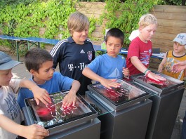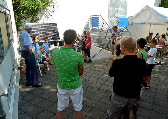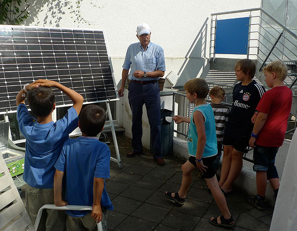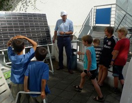 In weiteren Experimenten erlebten die neugierigen und interessierten 6-12jährigen, wie man mit Photovoltaik Lampen leuchten lässt und wie sie im Schatten wieder ausgehen. Wie Energie entsteht wusste ein kleiner „Ingenieur“: „Die Elektronen werden durch die Sonnestrahlen aus ihrem Sessel aufgescheucht und sausen durch den Stromkreislauf“. Dieser lässt die elektrische Birne leuchten.