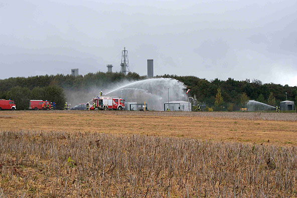 Teilnehmende Feuerwehren: Setzelbach, Rasdorf, Grüßelbach, Brandschutzaufsicht des Landkreises Fulda – 36 beteiligte Einsatzkräfte - Ausströmendes und brennendes Gas am Kavernenspeicher der Fa. Gas Union in Wölf/Reckrod