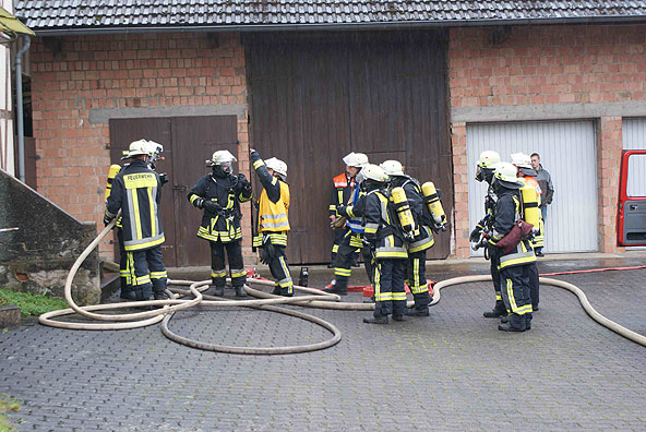 Teilnehmende Feuerwehren: Mittelaschenbach, Hofaschenbach, Rimmels, Silges, Rimmels, Haselstein, Gotthards, Brandschutzaufsicht des Landkreises Fulda – 48 beteiligte Einsatzkräfte - Brand in einem Landwirtschaftlichen Anwesen in Leibolz mit Menschen in Gefahr