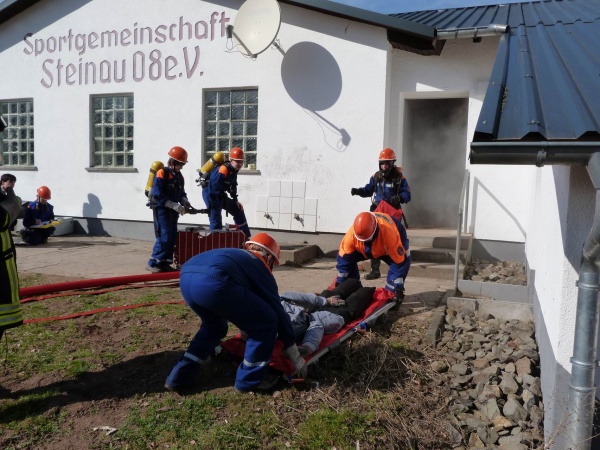 Natürlich kam es wie bei einer echten Berufsfeuerwehr auch zu einigen Einsätzen an diesem Tag. Nach der Alarmierung durch die „Übungsleitstelle Steinau“ rückten die jeweiligen Gruppen zu verschiedensten Szenarien aus. So musste eine Ölspur beseitigt werden oder es kam zu einem Unwettereinsatz, bei dem abgebrochene Äste von der Straße geräumt werden mussten. Neben einer Personenrettung aus dem verrauchten Sportlerheim in Steinau gab es auch einen unter Wasser stehenden Keller, der ausgepumpt werden musste.