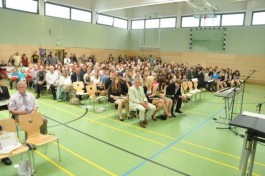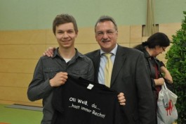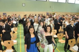 Schulsprecher Tobias Wenzel gratulierte seinen scheidenden Mitschülern zum erfolgreichen Abschluss. „Jetzt sitzt ihr alle hier, darauf habt ihr doch lange gewartet,“ sagte der Neuntklässler und erzählte die eine oder andere Anekdote, wie sie sich im täglichen Unterricht zugetragen haben könnte.
