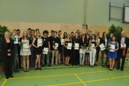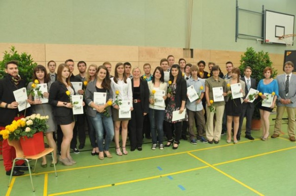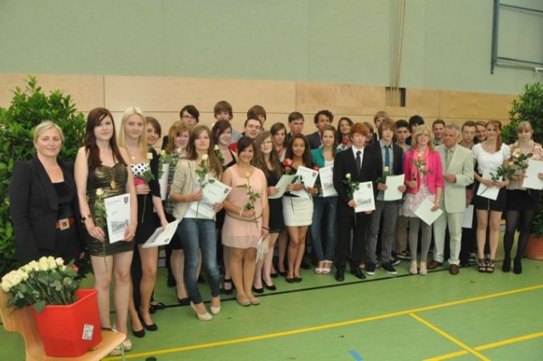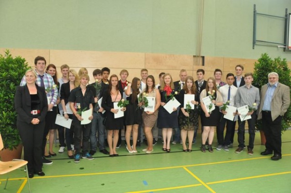 Weiterhin wurden Schülerinnen und Schüler geehrt, die sich durch besonderes Engagement neben ihrem Schulalltag hervorgetan haben. Wolfgang Jung bedankte sich bei den Schulbuslotsen, Thomas Euler bei den Schulsanitätern, Holger Uthe bei der Hausaufgabenbetreuung, Dirk Neuburger bei den Medienraumhelfern und Volker Dotzert bei den Bandmitgliedern. Schulleiterin Schüler schließlich bedankte sich bei den fünf Klassenlehrern der Abschlussklassen, denn „als Klassenlehrer hat man über das Unterrichten hinaus eine Fülle von zusätzlichen Aufgaben zu bewältigen.“ Sie überreichte kleine Präsente an die Lehrer Dirk Neuburger, Hans-Joachim Lehmann, Wolfgang Riese, Jürgen Hannig und Martin Ertelt. Vor dem eigentlichen Höhepunkt der Veranstaltung, der feierlichen Übergabe der Zeugnisse der Mittleren Reife, wurde Lehrer Jürgen Pfeiffer nach 44 Dienstjahren aus dem Schuldienst verabschiedet..