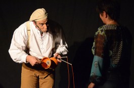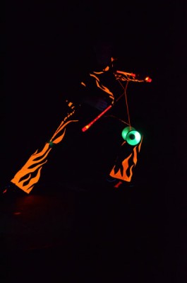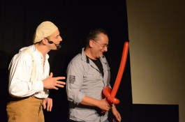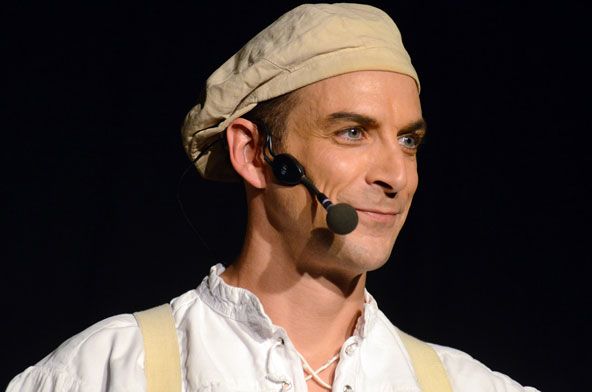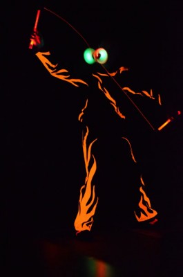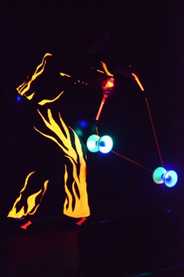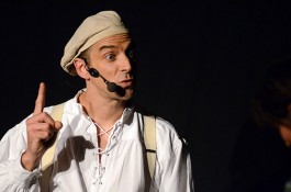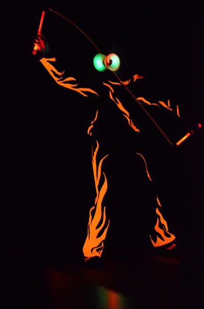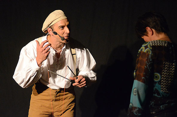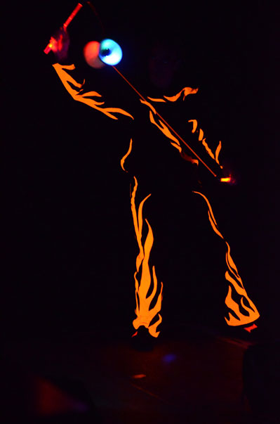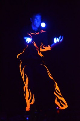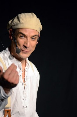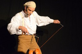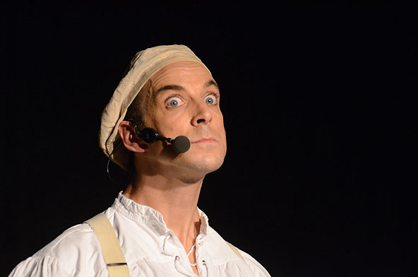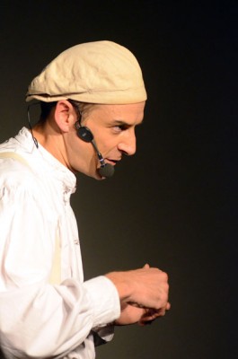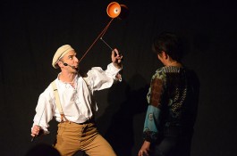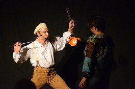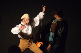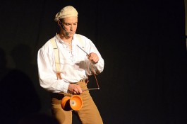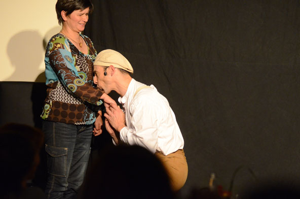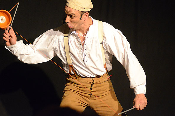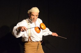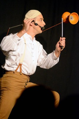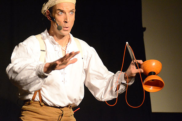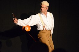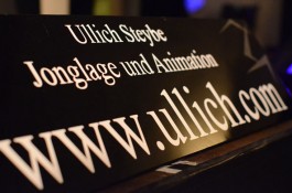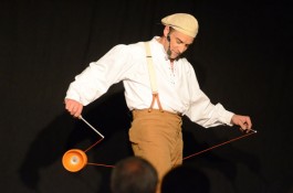 Tatsächlich ist er keiner von den Jongleuren, die nur Musik einspielen und dazu Gegenstände in der Schwebe halten. Für ihn ist die Jonglage eher eine Möglichkeit, seine Gedanken in überzeugende Bilder zu packen und auf diese amüsante Weise an den Mann und die Frau zu bringen. So erzählte er z.B. von den Sorgen, die einen oft hinterrücks überfallen – und schon flog ein Ball hinter seinem Rücken her. Auch die Geschichte vom Vakuum, das man einem Arm oder zwei füllen kann, gehört in diese Kategorie der genreüberschreitender Darbietung. Überhaupt merkte man dem Künstler deutlich an, dass er einen Faible für das Theater hat und dass er neben seiner Bühnentätigkeit auch Sozialpädagoge ist. Zirkus-Pädagoge, um genau zu sein.