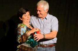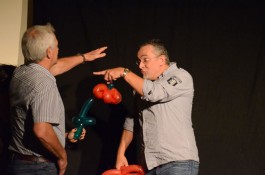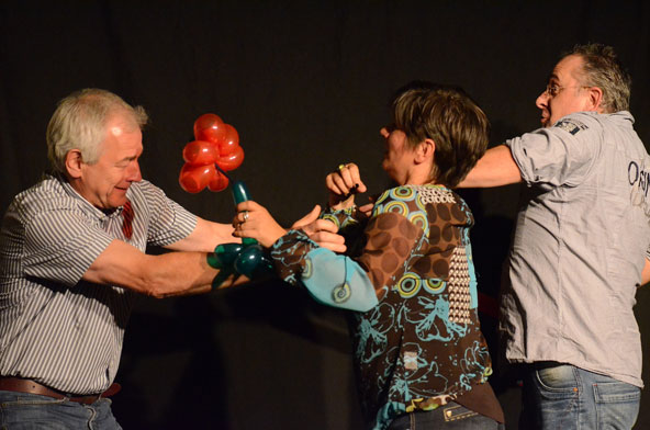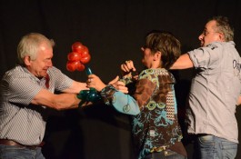 „Was ist das denn? Machen Sie in der Schule den Clown für die Kinder“, fragte ihn die bestens aufgelegte Gastgeberin der Reihe, Marianne Blum, im Interview. Nein, damit sei eher die aktive Zirkusarbeit gemeint, bei der die Teilnehmer selbst ran müssen und sich unter Anleitung als Artisten, Jongleure und Clowns ausprobieren dürfen. Das helfe vielen Menschen, Selbstvertrauen zu sich und Vertrauen zu anderen zu fassen, erklärte Steybe und demonstrierte spontan mit einem Zuschauer, wie so etwas praktisch aussehen kann. Überhaupt durften das Publikum wieder viel mitmachen bei diesem Gernsehen, was es sichtlich genoss und auch anschließend äußerte.