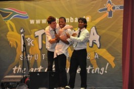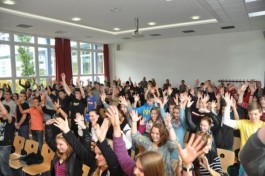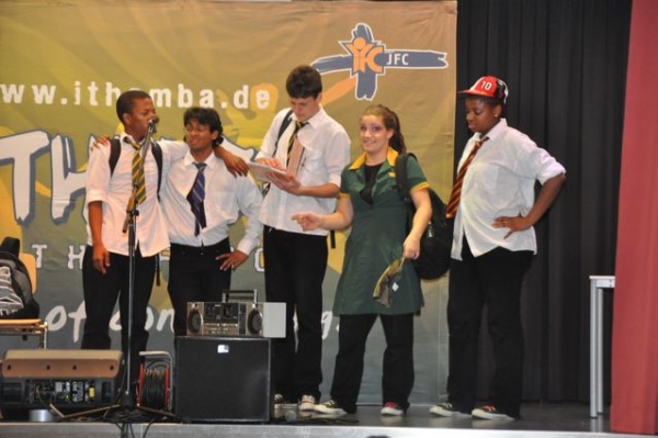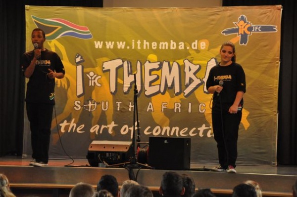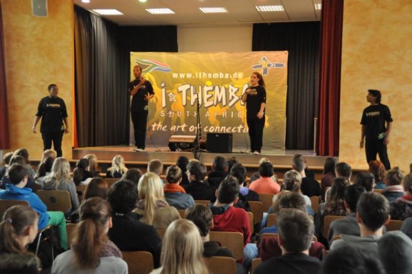 Es dauerte nur einen kurzen Moment, da hatten die jungen Leute aus Südafrika ihr Publikum im Griff: Mittanzen und Mitklatschen war das Motto, und rasch war die zweimal bestens besetzte Aula voll in Bewegung. Dabei ist das Anliegen des christlich geprägten Projekts „iThemba“ (das Wort bedeutet in der Zulu-Sprache Hoffnung) durchaus ernster Natur, die fetzige Musik, die Tanz- und Spieleinlagen sind lediglich Vehikel. Auch wenn die Apartheid offiziell als abgeschafft gilt – Rassismus ist in Südafrika noch immer ein Thema, und die Seuche Aids ist mittlerweile die häufigste Erkrankung. Erschreckend: Besonders Frauen und Kinder sind davon betroffen.