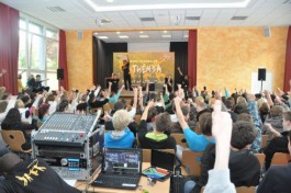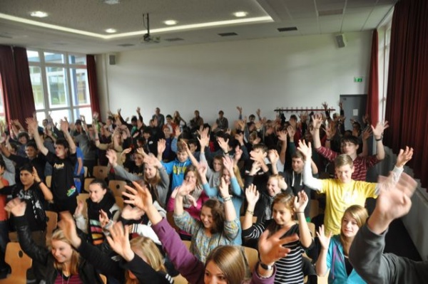 Die mehr als 300 Acht- und Neuntklässler spendeten nach den beiden Vorstellungen begeisterten Beifall. Schulleiterin Anke Schüler und der 2. Konrektor Ralf Kleemann, die die Gäste vor ihren Auftritten begrüßt hatten, freuten sich darüber, dass die Gruppe auf Vermittlung von KAS-Religionslehrerin Elisabeth Bornscheuer auch in diesem Jahr wieder den Weg in die Petersberger Realschule gefunden hatte.  (Text und Fotos: Adenauer-Schule)