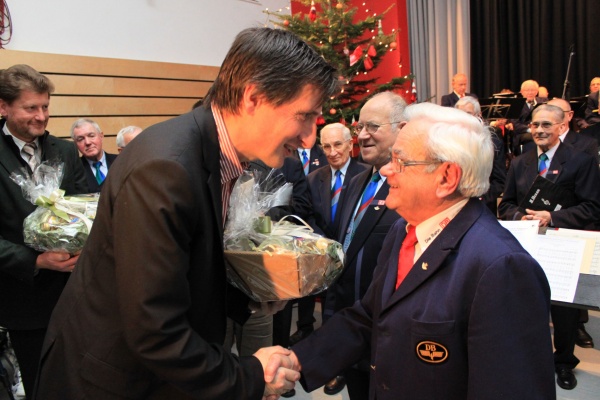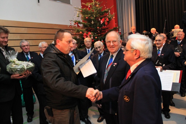 Zum Abschluss spielte das Ensemble «Stille Nacht» und den «Festmarsch Tochter Zion» bei dem Chor und Zuhörer gemeinsam einstimmten. Am Ende bedankte sich Rosemarie Müller vom Antoniusheim gemeinsam mit einigen Bewohnern, bei den „Eisenbahnern“ für ihr langjähriges Engagement. „Wir freuen uns, in diesem Jahr dieses tolle Jubiläum mit Ihnen zu feiern. Es gibt einige Bewohner, die noch keinen Ihrer Auftritte verpasst haben. Für sie und viele andere beginnt Weihnachten, wenn sie hier gespielt haben.“ Mit den besten Wünschen für das bevorstehende Weihnachtsfest, das neue Jahr und in Vorfreude auf das nächste Konzert, endete das Konzert und die Besucher gingen mit vorweihnachtlicher Stimmung nach Hause.