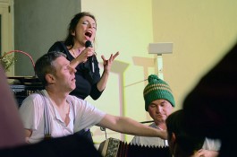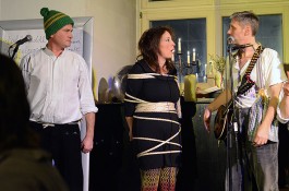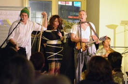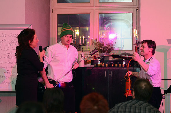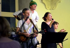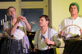 Martin Caba, Bandleader und Kopf der „Rhöner Säuwäntzt“, bewies durchweg komödiantisches Talent. Wenn er sich nicht gerade mit Marianne Blum ein urkomisches Wortgefecht lieferte, imitierte er beispielsweise mit Hilfe eines elektrischen Rasierers und „Obertongesangs“ einen Dudelsack, ahmte Grönemeyer in Rhöner Platt nach oder animierte das Publikum zu singen wie ein „tausendköpfiger Eunuchen Chor“. Seine Bandkollegen Christoph Günther (Hasenkistenbass) und Christoph Leipold (Waschbrett) unterstützen Caba (Mandoline/Gesang) nicht nur musikalisch, sondern trugen selbst durch ihre fulminante Darstellung von bauernschlau-verschrobenen Dorf-Originalen maßgeblich zur ausgelassenen und heiteren Grundstimmung im Museumscafé bei.