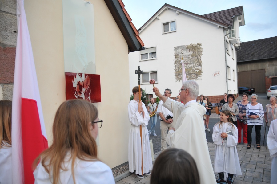 Die Sankt Anna Kirche in Grüsselbach als Kirche zu erkennen ist Sinn der an ihrer Außenfassade angebrachten Glaskunst. Rechtzeitig zum Patronatsfest und zum endgültigen Abschluss der Restaurierungsmaßnahme habe die Glaskünstlerin Susanne Isabell Bockelmann, Bad Saulgau diese fertigstellen können. Nach dem Festgottesdienst segnete Generalvikar Professor Dr. Gerhard Stanke, Fulda, das Kunstwerk. Er hatte auch die Festpredigt gehalten. Seit der Entscheidung des Verwaltungsrates die kleine Kirche umfassend zu restaurieren sind drei Jahre vergangen. Die Baukosten hätten ca. 170.000 Euro betragen und es seien 850 Stunden Eigenleistung erbracht worden, berichtete der geschäftsführende Vorstand und Vorsitzende des Verwaltungsrates Bernd Heller. Er sei zudem stolz, dass das Spendenbarometer fast 62.000 Euro betrage und dass die 200 – Seelen – Gemeinde. Sein Dank galt den an der Maßnahme beteiligten Pfarrern Rudolf Zeller, jetzt Eichenzell sowie Ulrich Piesche und Reiner Modenbach, ebenso Architekt Werner Heumüller, Geisa der Bauabteilung des Bistums Fulda mit Dr. Burghard Preusler und Thomas Beer. Ein besonderes Kleinod sei das Glaskunstwerk von Susanne Isabell Bockelmann. Auf der Suche nach einem neuartigen Symbol der Heiligen Mutter Anna entstand ein Objekt aus Antikglas auf dem sich angedeutet eine menschliche Figur finden lässt. Beine und Proportionen des Körpers sind nur zu erahnen und zeigen vom Licht beeinflusste Unterschiedlichkeiten. Da wo der Bauch sich befindet breitet sich ein Blumengebinde aus, dass durch die Farbe „Rot“ dominiert. Das „Anna – Blühen“ beziehe sich auf Anna als Mutter Mariens und Großmutter des Jesus – Knaben und sei eine moderne Form der „Anna – Selbstdritt“, die in vielen Kirchen zu finden sei, so die Künstlerin. Gleichzeitig sollten die Kunstobjekte dem ortsfremden Betrachter helfen, den „eher profanen Anbau“ als sakrales Gebäude identifizieren zu können. Zudem würde durch die Form, sowie das rote geätzte Antikglas in Korrespondenz zu den Ecksteinen eine Kreuzform angedeutet. Diözesanbaumeister Dr. Burghard Preusler zeigte sich auch überzeugt, dass die Künstlerin mit dem entwickelten Rot gekonnte die Mutterliebe und Blutsverwandtschaft der Heiligen Anna zu Maria und Jesus abgebildet habe. Im Anschluss segnete der Fuldaer Generalvikar die Darstellung und die kleinformatige Glaskunsttafel mit dem Schriftzug „Sankt Anna“ neben der Eingangstür. Begonnen hatte das Patronatsfest mit einem feierlichen Gottesdienst in Konzelebration der Pfarrer Rudolf Zeller, Ulrich Piesche, Reiner Modenbach, Nikolaus Schwarz und Dr. Jean Parfait Ntsama mit Generalvikar Gerhard Stanke. Anschließend gab es Festbetrieb im Dorfmittelpunkt am Grüsselbach.