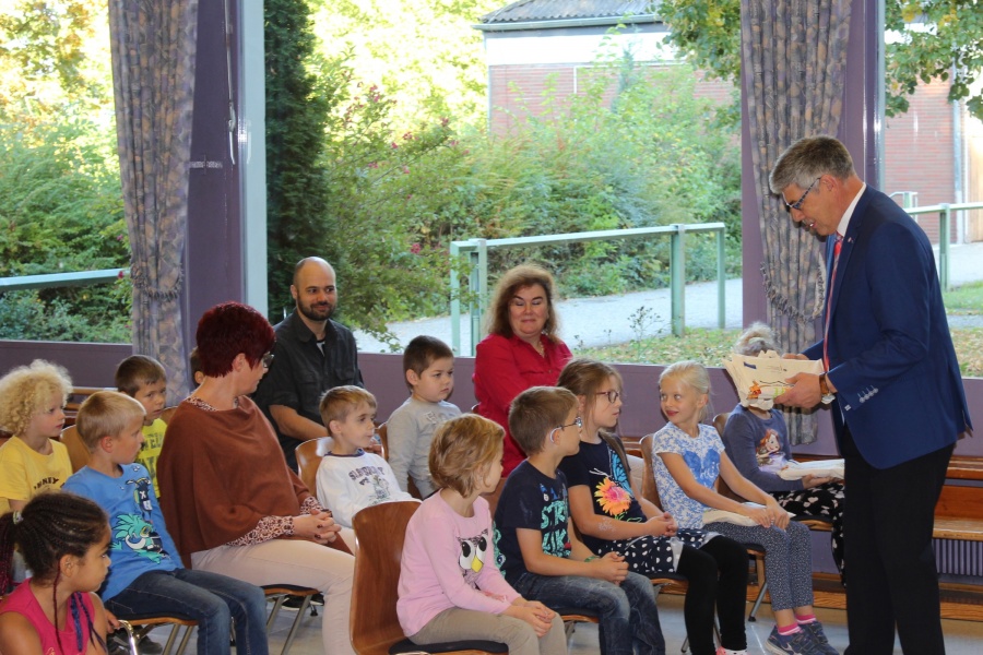 Landrat Manfred Görig besuchte die Grundschule in Romrod, um für das bundesweite Lesestartprojekt zu werben und das „Lesestart-Set 3“...