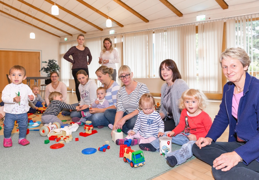 Zweijährige Knirpse, die im „Miniclub“ auf Gleichaltrige treffen; Frauen im mittleren Alter, die Körper und Geist mit Gymnastik zur...