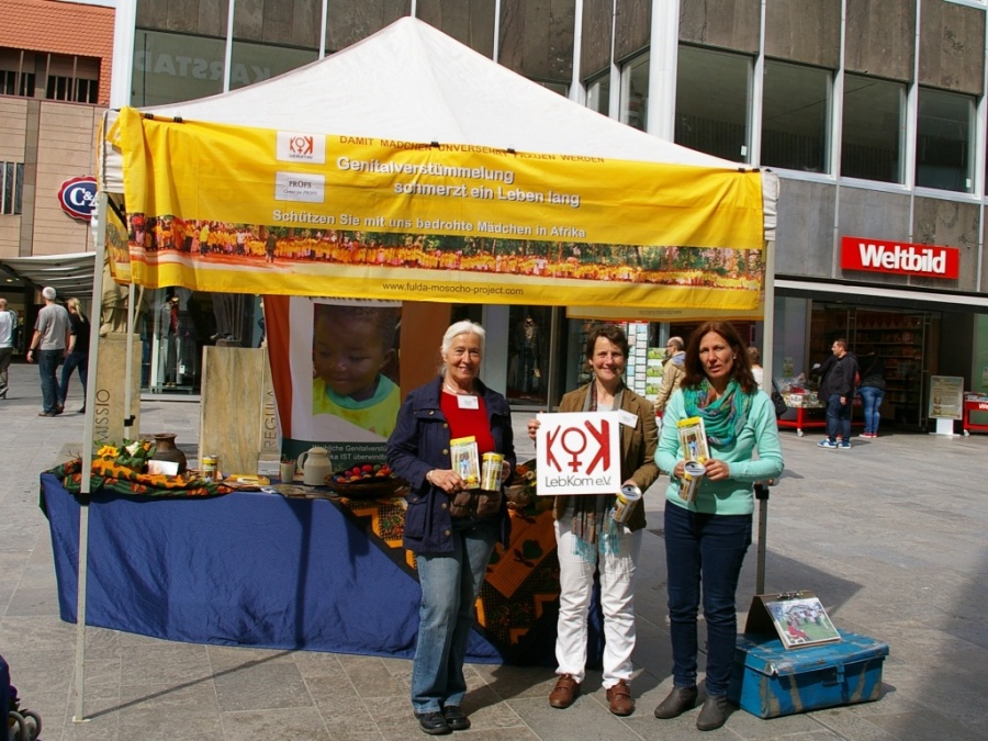 Freudestrahlend stehen die drei Frauen vom Verein Lebendige Kommunikation e.V. auf dem Fuldaer Borgiasplatz und kommen mit Passanten ins...