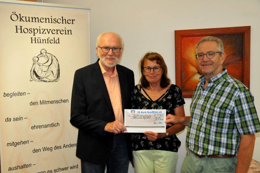 Einen Spendenscheck in Höhe von 530 Euro konnte Anni Schön (Mitte) in Vertretung der „Mackenzeller Kuchenfrauen“ an Vorsitzenden Josef Herbst (links) und Koordinator Hermann Held (rechts) vom Ökumenischen Hospizverein in Hünfeld übergeben. Seit mehr als 20 Jahren backen die Frauen aus Mackenzell und Hünfeld Kuchen und verköstigen gegen Spende im Marienwallfahrtsort Maria im Grünen Tal bei Retzbach die Walldürnwallfahrer. Diese machen am dritten Tag ihrer viereinhalbtägigen Fußwallfahrt von Fulda nach Walldürn im Odenwald dort eine Pause. In diesem Jahr hatten die acht Frauen 18 Kuchen und 27 Liter Kaffee ausgegeben. Dazu kamen noch belegte Brote und Salzgebäck. Jedes Jahr unterstützen die Kuchenfrauen mit der Spendeneinnahme ein anderes soziales Projekt. Der Vorsitzende als auch der Koordinator betonten gleichermaßen, dass mit dem Geld die Arbeit der Ehrenamtlichen, von denen zurzeit 12 aktiv 20 Personen begleiten, finanziert würde. Hospizarbeit verhindere Suizidalität und den Wunsch nach aktiver Sterbehilfe.