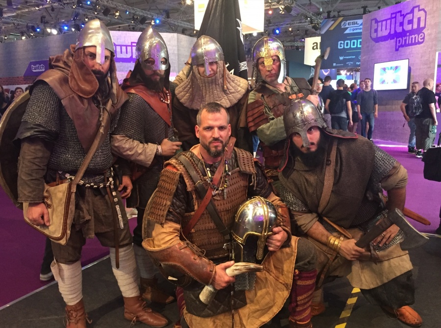 „Raubzug“ mit Stahlrüstung, Streitaxt und Schwert Fuldaer Wikinger auf der Messe „Gamescom“ in Köln