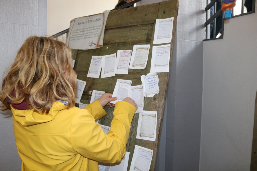 Schülerinnen und Schüler der Albert-Schweitzer-Schule nageln ihre Kirchenthesen an die Tür