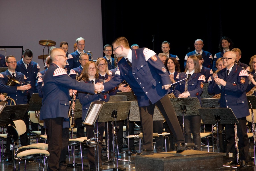 Karl-Heinz Vogel übergibt nach 21 Jahren Dirigententätigkeit im Orchester der FFW Dirlos den Taktstock an Nachfolger René Wilhelm „Man...