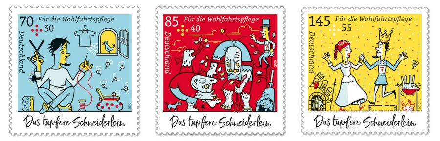 Die Wohlfahrtsmarken 2019 zeigen erneut Motive eines Grimmschen Märchens: Das tapfere Schneiderlein und seine Erlebnisse zieren den neuen...
