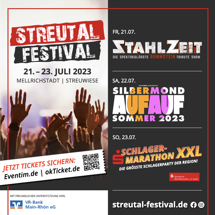 1. Streutal Festival vom 21. bis 23. Juli 2023 in Mellrichstadt / Openair Konzerte mit Stahlzeit, Silbermond und Schlager-Marathon XXL /...