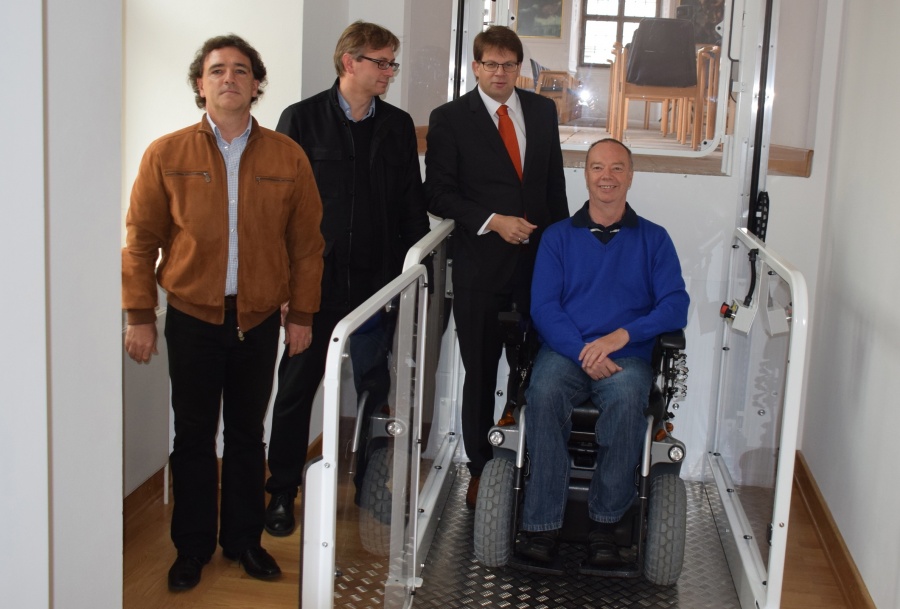 Sanft schwebt der neue Behinderten-Lift vom Niveau des Vorraums auf die Ebene der Kapelle des Vonderau Museums. Zufriedene Gesichter bei...