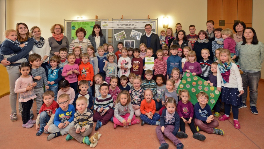 Steinauer Kindergarten Sankt Jakobus erhält vom Ersten Kreisbeigeordneten Frederik Schmitt Plakette „Haus der Kleinen Forscher“