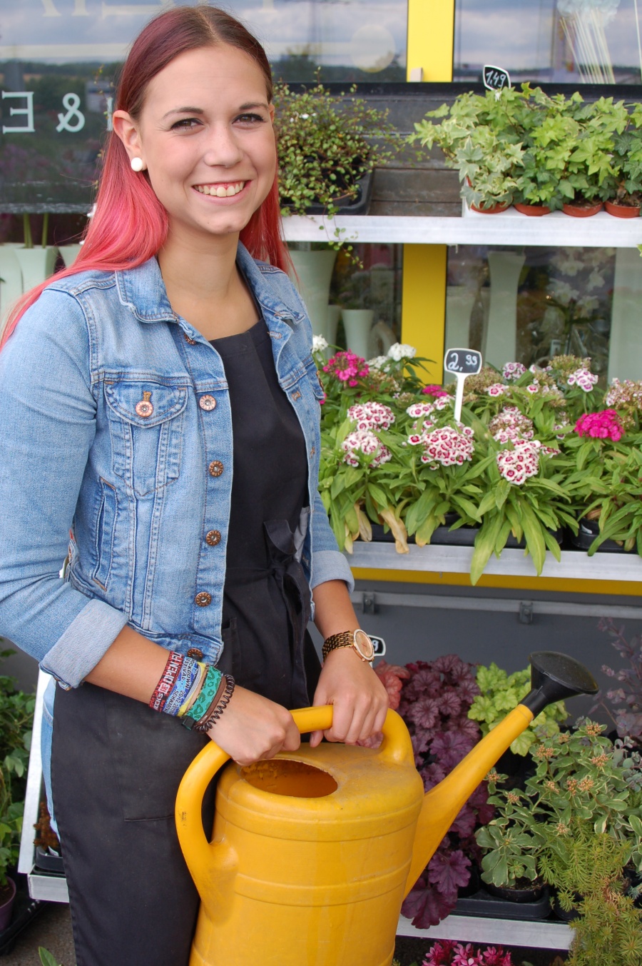Celina steht im Außenbereich des Blumendladens, gießt fleißig die zig Blumen und fühlt sich dabei sichtlich wohl in ihrem Element....