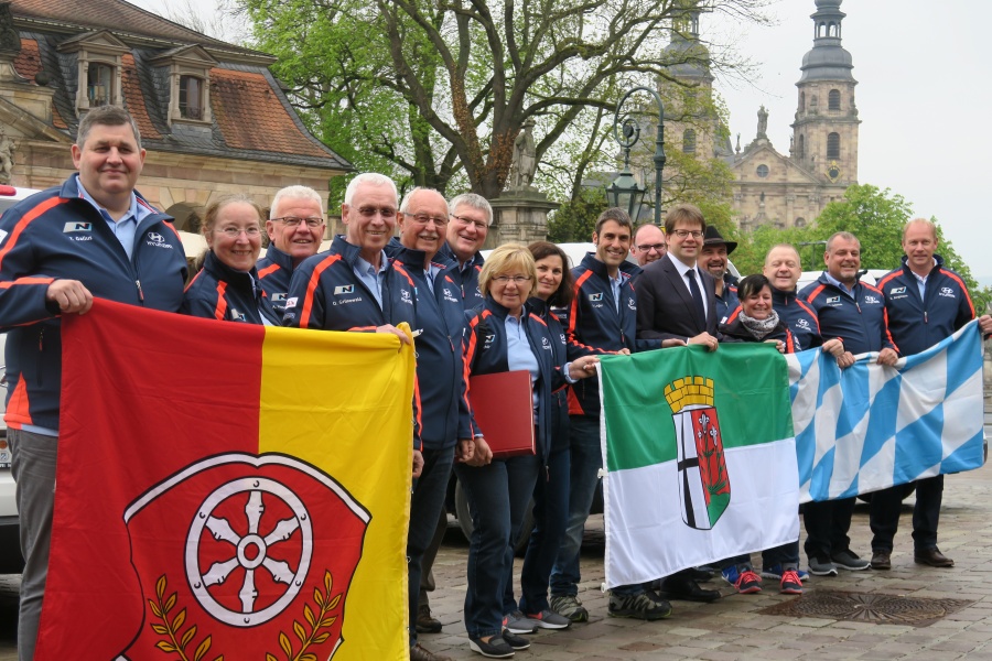 Ungewöhnliche Flaggenparade vor dem Fuldaer Stadtschloss: Das weiß-blaue Rautenbanner Bayerns und das gelb-rote Stadtwappen Alzenaus mit...