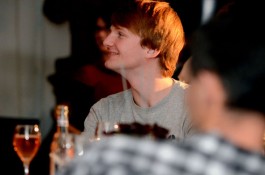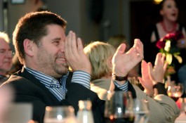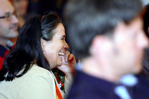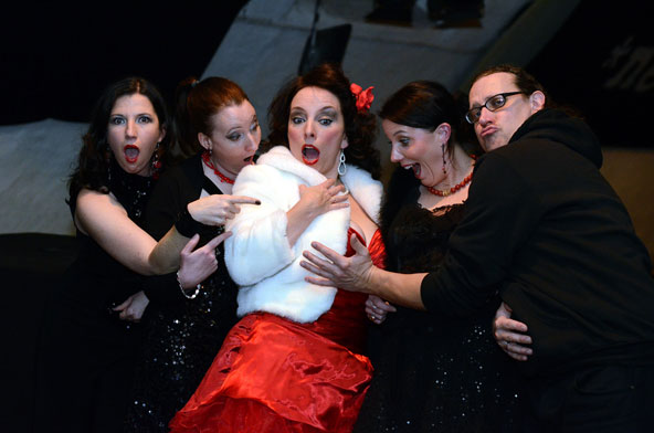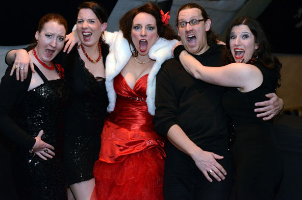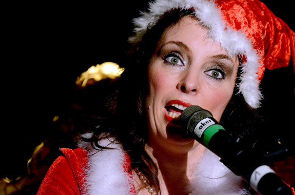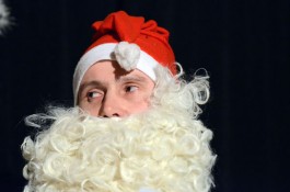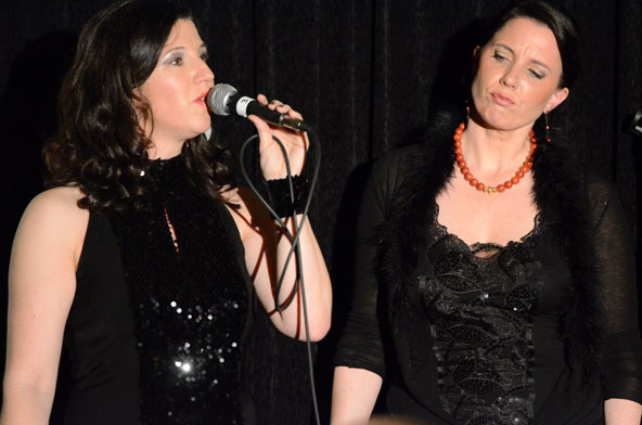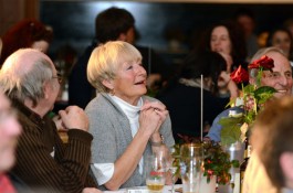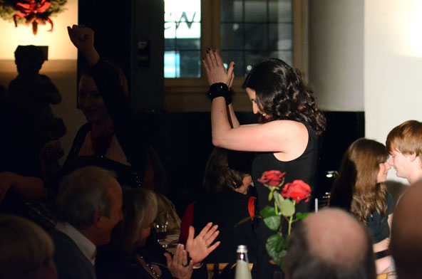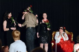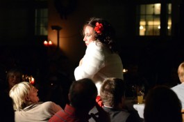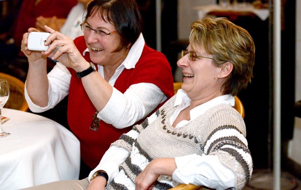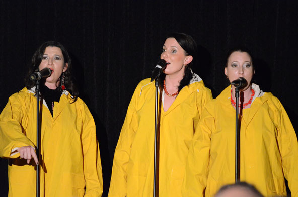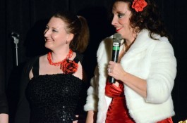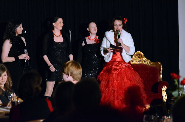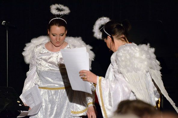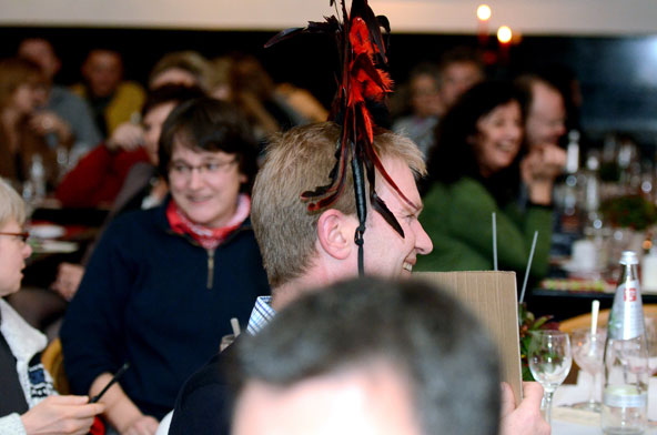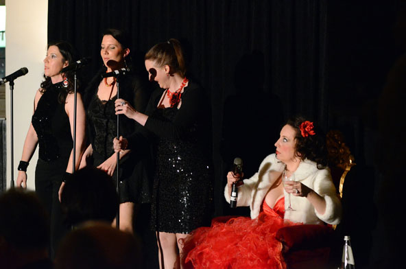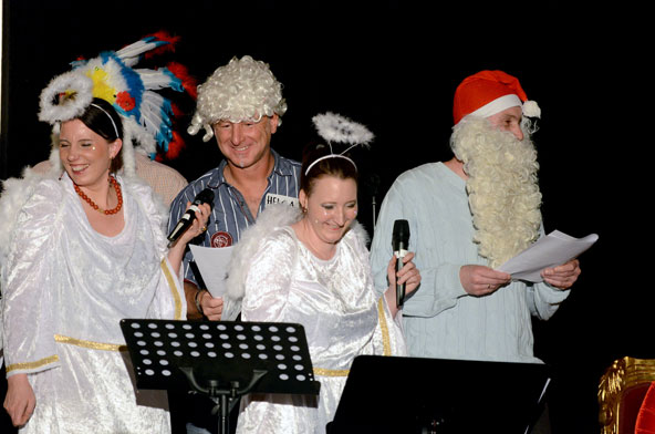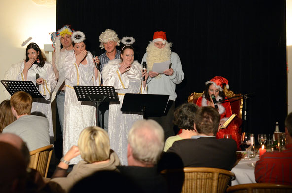 Ein weiteres Highlight war das interaktive Hörspiel, an dem zahlreiche Zuschauer aus dem Publikum teilnahmen. Es gab große und kleine Rollen in hessischer Mundart und Rollen zur Untermalung der Geräuschkulisse. Eigens für diesen Abend schrieb Blum das Weihnachtshörspiel „drei Engel für Helga“, eine etwas andere Weihnachtsgeschichte, in der es um den bevorstehenden Weltuntergang nach dem Kalender der Maya ging. Sabinett erschien nicht nur in zauberhaften Engelskostümen sondern zeigte in einer pantomimisch dargestellten Kampfszene, dass die Sängerinnen für jeden Spaß zu haben sind. Während Marianne Blum in einem gold- roten Weihnachtsthron humorvoll durch das amüsante Hörspiel manövrierte, bewies das Publikum Spontanität und Spielfreude und trug so selbst zu einem tollen unterhaltsamen Abend bei. Zwischen Musik und Talk ließen sich die Zuschauer das 3-Gang-Menü schmecken. Verabschiedet wurden sie mit einem kraftvollen Jingle Bells, gesungen von Blum und Sabinett gemeinsam. Mit der nötigen Weihnachtsstimmung, satt und bestens unterhalten wurde das Publikum nach dreistündigem Entertainment von Feinsten nach Hause entlassen. Bis zum nächsten Mal, am 30.Januar 2013, wenn es heißt: „Schwatz deutsch oder schiss Buchstöbe”, zu Gast bei „Gernsehen“ sind  „DIE RHÖNER SÄUWÄNTZT“.