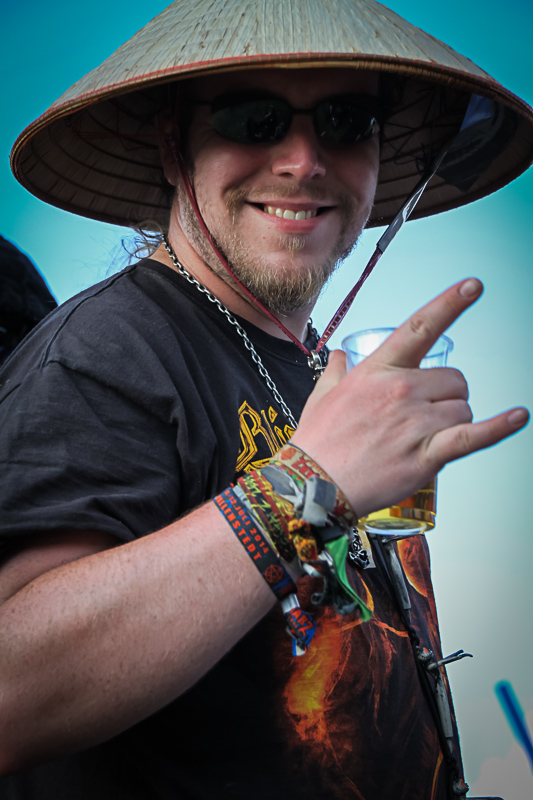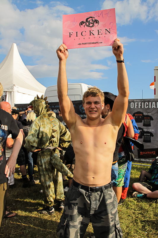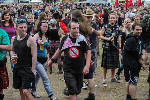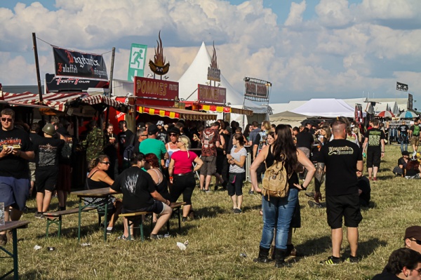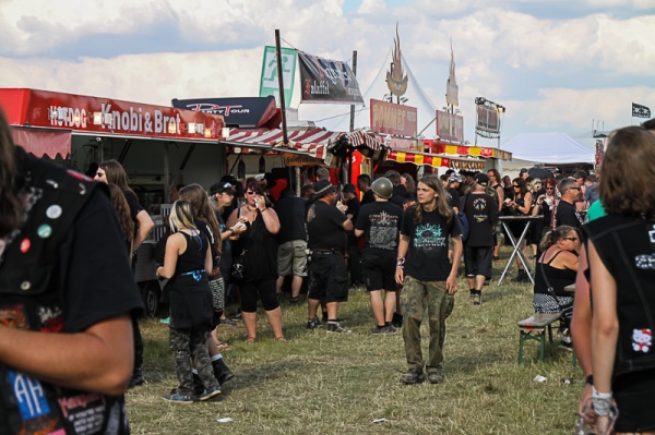 Wer es am Mittwoch nicht geschafft hat anzureisen, kommt am Donnerstag nach. In diesem Jahr gibt es bezüglich des Campings eine Neuerung. Durch die Einteilung des Geländes in vier Bereiche, wovon einer für den Donnerstag gesperrt bleibt, ist es den Nachzüglern noch möglich einen guten Platz zu ergattern. Als um 14 Uhr das Festivalgelände eröffnet wird, überrascht die Sonne mit fast durchgehender Präsenz, was die gute Laune der Besucher nur noch steigert. Wie immer ist auch hier wieder an alles Gedacht. Die Auswahl der angebotenen Speisen ist groß und reicht von Pommes und Burger über Pizza und Baguettes bis hin zu Thailändischen Gerichten. Die Getränkeauswahl wird in diesem Jahr mit Sekt und Diätgetränken sowie alkoholfreies Bier aufgestockt, auch wenn der meiste Absatz wie üblich im normalen Gerstensaft liegt. Natürlich gibt es auch allerhand zu kaufen. T-shirts, Cd´s, Trinkhörner und Schmuck, um nur einen sehr kleinen Teil aufzuzählen. Die „Einkaufsmeile“ darf nicht fehlen und lädt zwischendurch zum Bummeln ein, was auch gern angenommen wird.