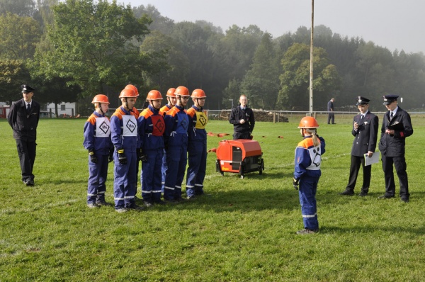 Bei dem sogenannten Löschangriff handelte es sich um eine Brandbekämpfung nach Vorgabe des Bundeswettbewerb der Deutschen Jugendfeuerwehr unter Vornahme von drei Strahlrohren. Das Wasser wurde aus einem Hydrant entnommen. Allerdings verlief die Übung wegen der möglichen Unfallgefahren ohne Wasser. Die Schwierigkeit bestand allerdings darin einige Hindernisse mit der Ausrüstung zu überwinden. Dies geschah unter strenger Aufsicht von Wertungsrichtern aus den teilnehmenden Landkreisen. Kreisjugendfeuerwehrwart Steffen Hohmann konnte über den ganzen Tag zahlreiche Gäste aus Politik und Feuerwehr im Mackenzeller Schlossparkstadion willkommen heißen.