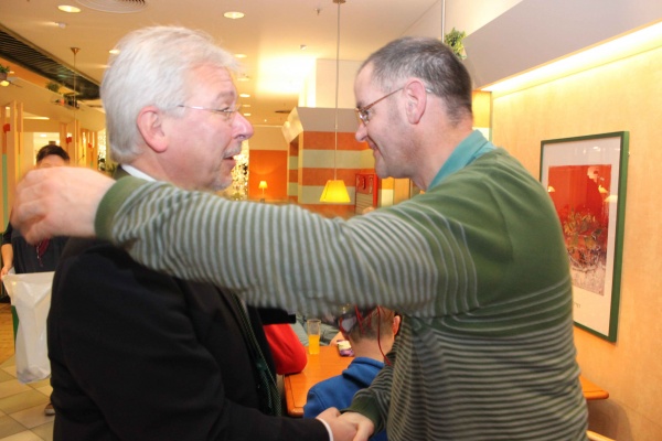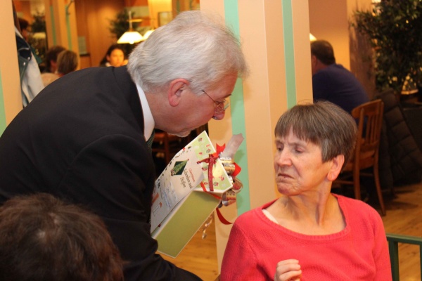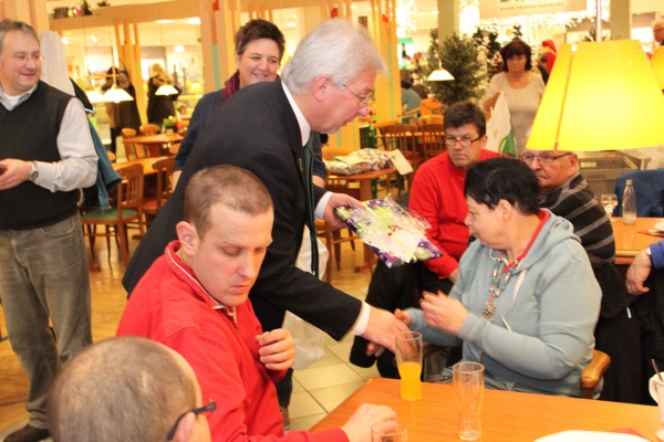 Fulda. Drei Wochen lang stand der Wunschbaum von Galeria Kaufhof im Verkaufsraum des Kaufhauses. Rund 90 Bewohnerinnen und Bewohner des Antoniusheims haben ihre Wünsche drauf geschrieben und die Kundinnen und Kunden von Kaufhof konnten diese erfüllen. Am Freitag fand dann im Dinea Restaurant die Geschenkübergabe statt. Tanja Preis, Leiterin des Bereichs „Wohnen“ im Antoniusheims, dankte dem Geschäftsführer von Kaufhof, Hartmut Abel, und seinem Team für das Engagement. „Es freut uns, dass wir auch in diesem Jahr wieder zu Ihnen kommen durften“, sagte Preis bei der Geschenkeübergabe. „Wir feiern dieses Jahr 10 jähriges Jubiläum und es macht mir jedes Mal eine große Freude, wenn ihr zu uns kommt“, sagte Abel, der noch eine kleine Überraschung bereithielt. „Der Verein „Familienbande Michelsrombach“ hat sich aufgelöst und übergibt von dem übrig gebliebenen Geld aus der Vereinskasse 10 Euro Gutscheine im Gesamtwert von 500 Euro an die Bewohner des Antoniusheims.“