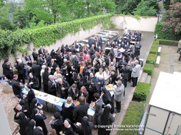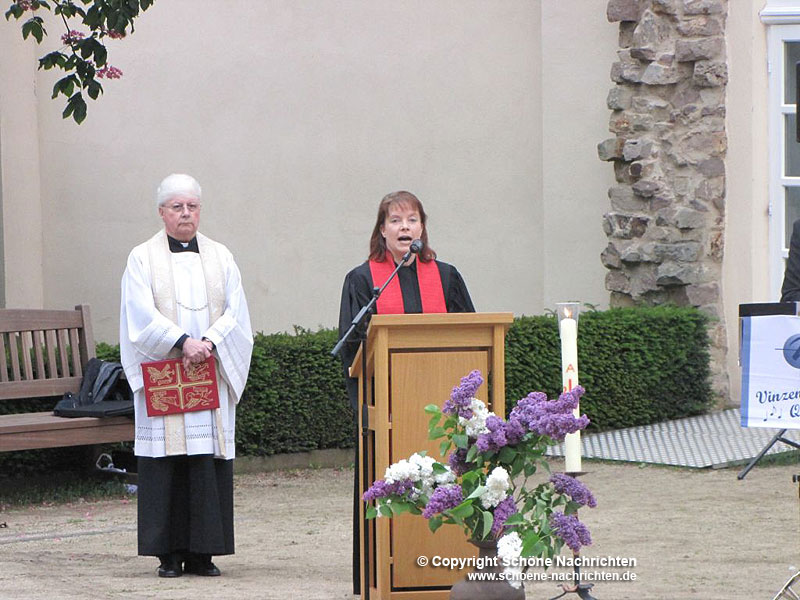 Im Anschluss begab sich die Gruppe auf den Weg zur Musikschule in der Buseckstraße, dem „Ort des Ursprungs.“ Im Bereich der ehemaligen Krankenhauskapelle feierten Schwestern und Mitarbeiter unter freiem Himmel gemeinsam einen ökumenischen Wortgottesdienst, der von Pfarrerin Petra Hegmann und Stadtpfarrer Winfried Reith gehalten wurde. Nach der Begrüßung der Festgemeinde durch Generaloberin Schwester Maria Rosalia zeichnete Sr. Dominika Krönung einige wichtige und interessante Ereignisse zur historischen Gründung des damaligen Landkrankenhauses und zum ersten Einsatz der Barmherzigen Schwestern im vinzentinischen Dienst nach.