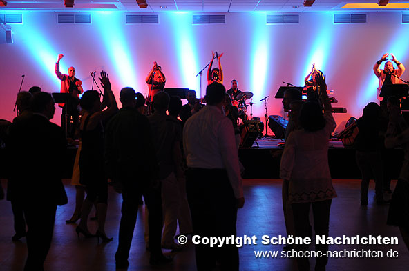 „Ein geselliger Abend soll es sein – völlig locker und ungezwungen“, so lautete das Ansinnen der Gastgeber und genau in diese Atmosphäre tauchten die Gäste nur zu gerne ein. Die Famous 9 überzeugten in zehnköpfiger Besetzung mit einem erstklassigen Konzert und liefen mit ihrem vielfältigen Repertoire zu Höchstform auf. Wenngleich das angenehme Sommerwetter die Gäste zuerst auf der großzügigen Terrasse hielt, wurde zur späteren Stunde das Tanzparkett ausgiebig in „Beschlag“ genommen.