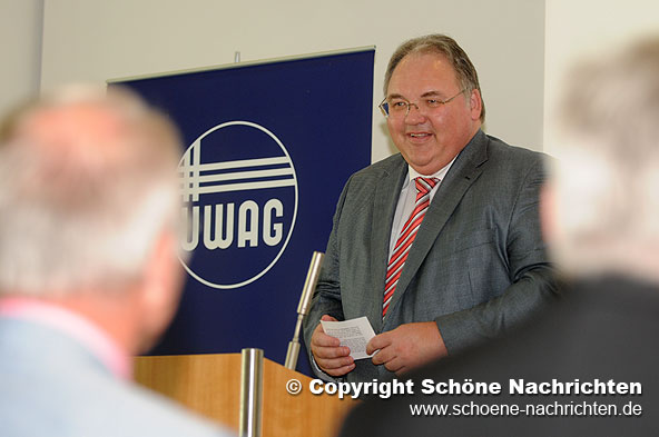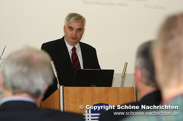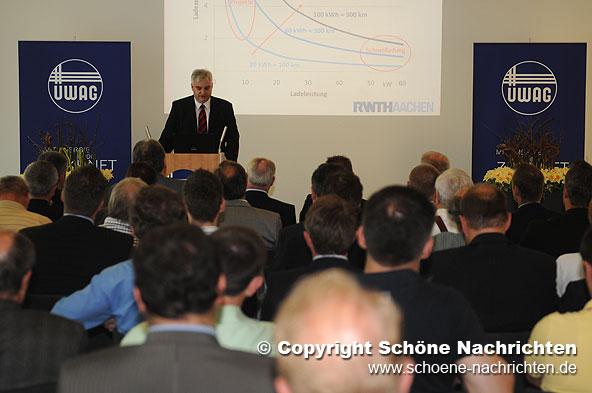 Die zentralen Aspekte für ein optimales Zusammenspiel von Elektrofahrzeugen und Netzbetrieb beleuchtete auch Universitäts-Professor Dr.-Ing. Albert Moser, Leiter des Instituts für Elektrische Anlagen und Energiewirtschaft (IAEW) der RWTH Aachen, in seinem Fachvortrag zur Eröffnung der Ausstellung im ÜWAG-Kundenzentrum. Mit seinen Ausführungen unter der Überschrift „Elektromobilität – Herausforderungen und Chancen“ gab Professor Moser seinen Zuhörern darüber hinaus einen Einblick in die Historie der Elektrofahrzeuge und stellte aktuelle Projekte und Prognosen vor.