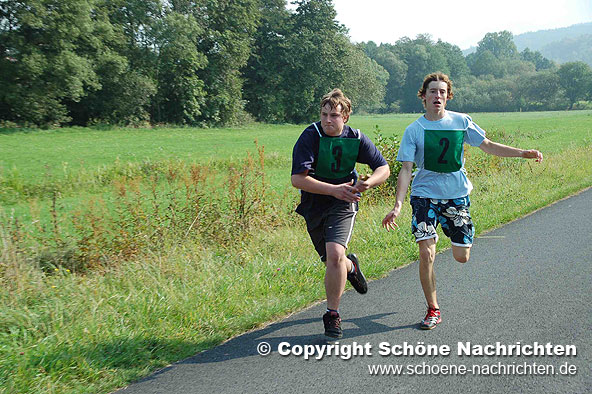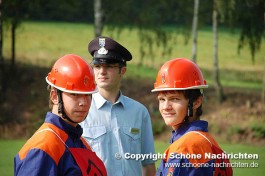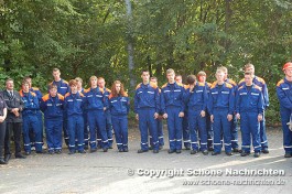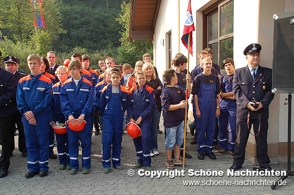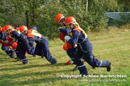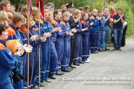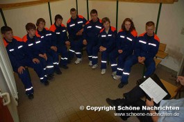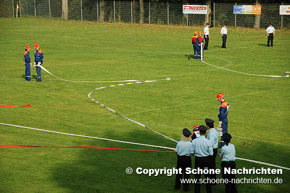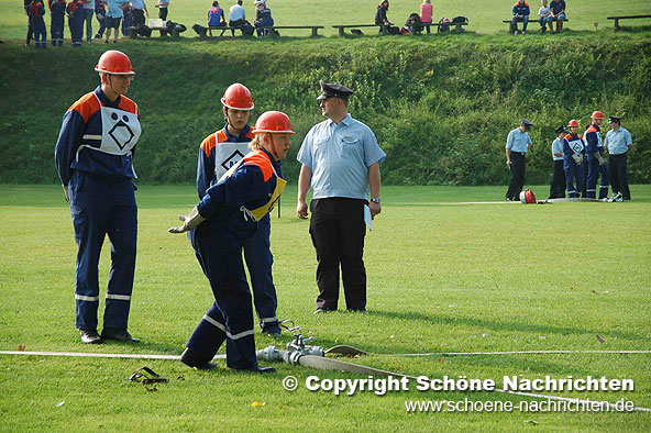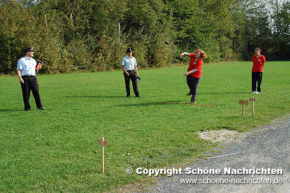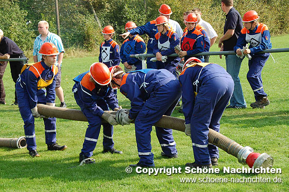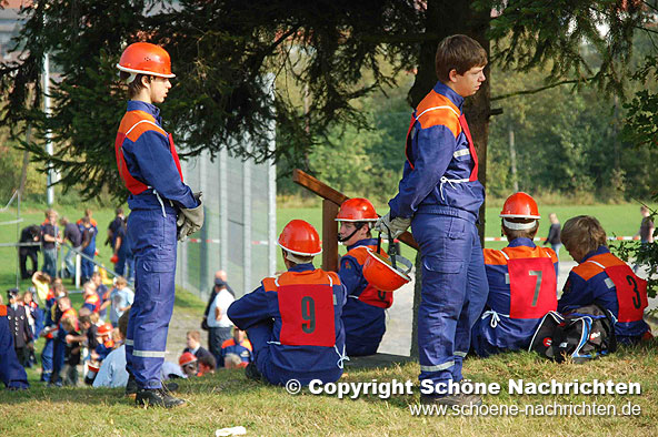 Der theoretische Teil, bei dem Fragen aus der Feuerwehrorganisation, Gerätekunde, Löschverfahren, Löschmittel und Unfallverhütung sowie aus dem Bereich Gesellschaft und Jugendpolitik abgefragt wurden, rundeten die Prüfung ab. Der Sporttest bestand aus einem 1500 Meter – Staffellauf in einer Gesamtzeit von mindestens 4 Minuten und 10 Sekunden. Ein weiterer Prüfstein war das Kugelstoßen. Hier musste die Kugel mit allen 9 Gruppenmitgliedern mindestens 55 Meter weit gestoßen werden. Weiterhin gab es Punkte auf den Eindruck über das Verhalten und Auftreten der Gruppe während der Übungen. Alles zusammen ergab ein Endergebnis welches nach den Richtlinien positiv ausfallen musste. Die Prüfungen wurden durch den Abnahmeberechtigten der Deutschen Jugendfeuerwehr Harald Breitenbach aus Vellmar vorgenommen. Unterstützt wurde er hierbei vom Wertungsrichterteam der Kreisjugendfeuerwehr Fulda.