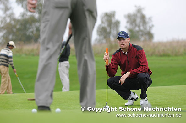 Und schon bald kamen nur noch die drei Spieler des Leader-Flights für den Sieg in den beiden Kategorien in Frage: Jochen Lupprian, Steen Ottosen und Bernd Ritthammer lieferten sich einen verbissenen, hochklassigen Schlagabtausch im Nieselregen. Die Führung wechselte ständig, mal lag Ritthammer vor Ottosen – und damit auf Kurs Gesamtsieg – mal Ottosen vor Ritthammer – mit der Aussicht, die Saison 2009 seinerseits auf Platz 1 abzuschließen. Und Jochen Lupprian lag meist einen oder zwei Schläge vor den beiden Mitspielern und steuerte auf den Sieg beim letzten Turnier des Jahres zu.