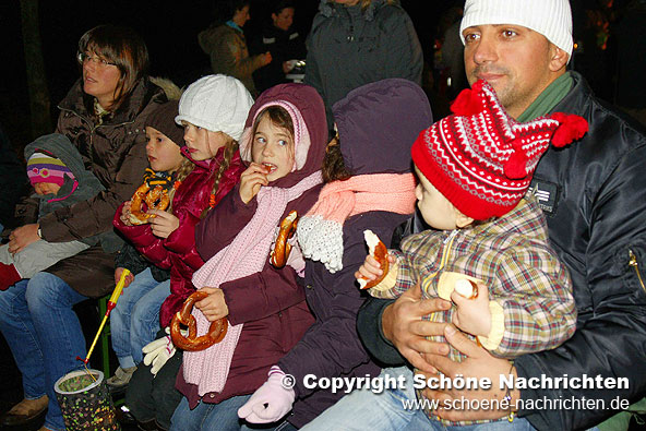 An einzelnen Stationen wurde Halt gemacht, damit die Kinder den Reiter besser sehen und man gemeinsam zu Gitarrenklängen singen konnte. Nach dem Umzug waren alle eingeladen, sich mit Essen und Trinken zu stärken und aufzuwärmen. Neben Glühwein, Kinderpunsch und Orangensaft konnte man sich mit Würstchen im Brötchen oder Brezeln versorgen. Dank des trockenen Wetters konnten alle noch ein wenig am Martinsfeuer verweilen und ließen den Abend allmählich ausklingen.