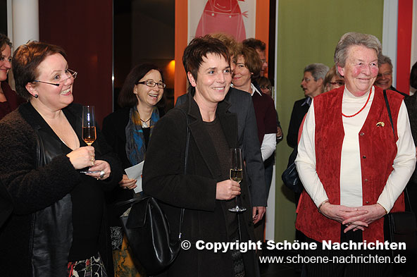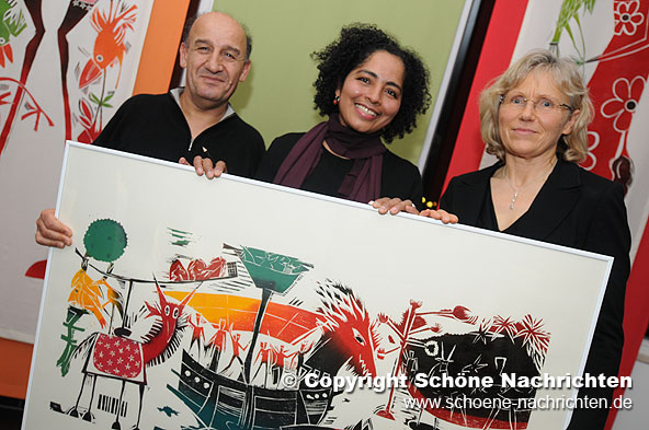 Ein Highlight der Finissage stellte die Präsentation der Bücher mit Original-Holzschnitten als Illustrationen dar. In ihrer gewinnenden Art erzählte Tita die Geschichten und erklärte den interessierten Zuhörern die Holzschnitt-Technik. Die Gäste waren begeistert von den Ausführungen der äußerst sympathischen Künstlerin und natürlich von ihren Werken, die in allen drei Ebenen und im gesamten Treppenhaus des ungewöhnlichen Gebäudes ausgestellt waren. Die Bilder stellen großenteils Kindheitserinnerungen und eine Verarbeitung ihrer brasilianischen Wurzeln dar.