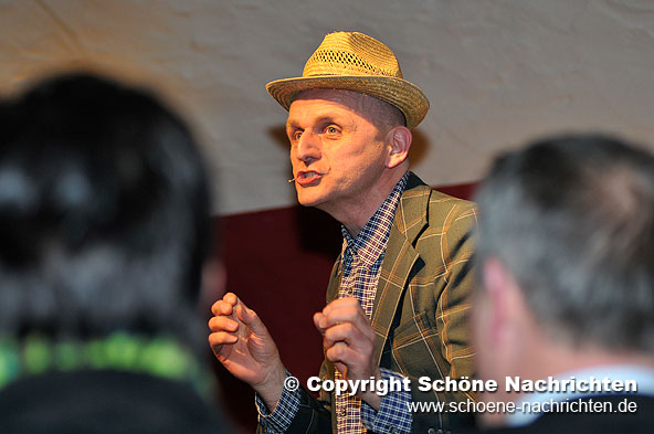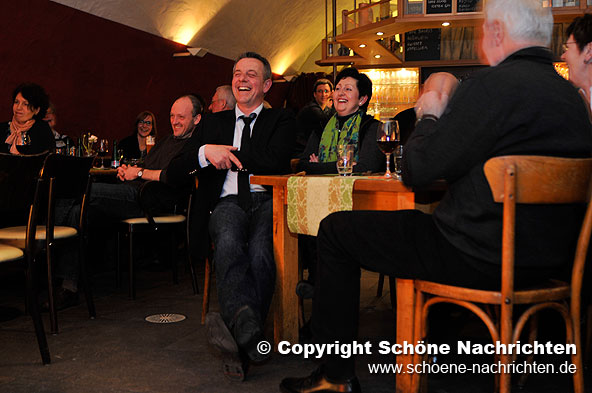 Dabei wurde nichts ausgespart, weder die Frage nach dem richtigen Bodenbelag auf dem neugestalteten Uniplatz in Fulda, noch die nach dem richtigen Koalitionspartner für den Fall, dass Habersack es mit seiner Partei, der BOP (Buideonkels Partei) in die Bundespolitik schafft. Egal, ob es um die Sehenswürdigkeiten in “Hofbieber”, der Heimatgemeinde von Habersack, die Frage nach der Verkehrsanbindung Fuldas, um Bundespolitik, um internationale Finanzwirtschaft oder sogar um pikante Details aus Habersacks Privatleben ging, auf alle Fragen wusste der überzeugte Single eine Antwort. Sehr zur Freude des Publikums, das sich vor Lachen kaum halten konnte und die kurzweiligen Talkrunden mit dem Original ebenso genoss wie das 3-Gänge Menü, das die Küche des Museumskellers passenderweise aus regionalen Spezialitäten zusammengestellt hatte.