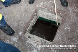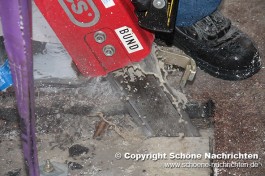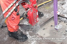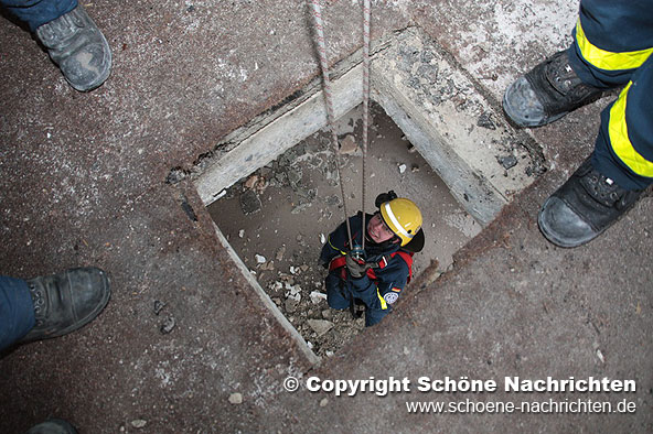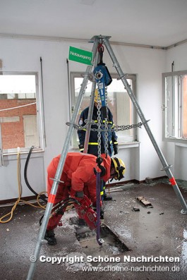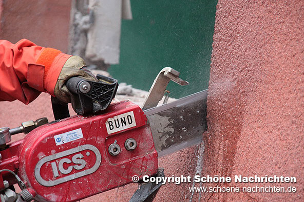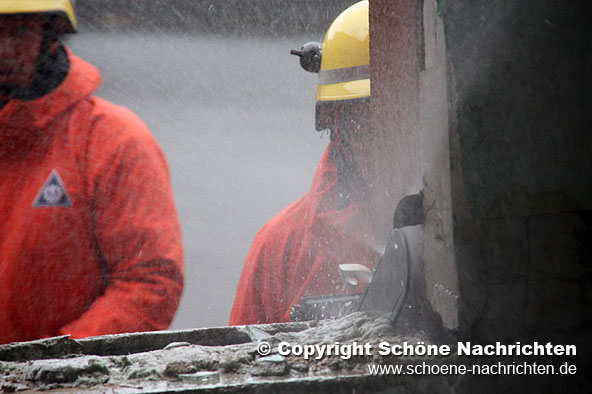 Nach der Soforterkundung wurde festgestellt, dass die einzige Möglichkeit an den Heizungsraum im Keller zu gelangen, durch eine ca. 40 cm starke Betondecke im 1. Obergeschoss war. Der Gruppenführer der ersten Bergungsgruppe, Florian Johannes, forderte durch die Einsatzleitung schweres Gerät an die Einsatzstelle nach. Zwischenzeitlich bereiteten die Helfer bereits alles zur Schaffung einer Rettungsöffnung vor.