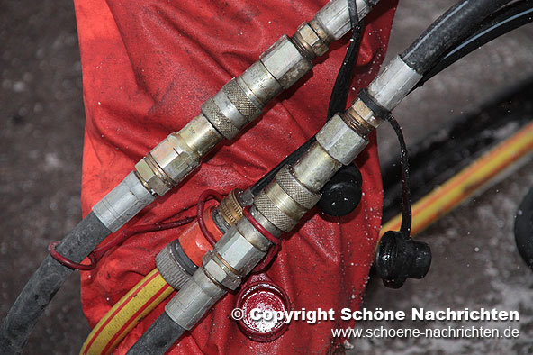 Nach dem Eintreffen des angeforderten Materials wurde mit dem Aufbau der Betonkettensäge und eines schweren Kettenzuges zur Sicherung gegen abstürzen der Decke begonnen. Etwa 45 Minuten und 700 Liter Kühlwasser der Betonkettensäge später ging die Meldung “Rettungsöffnung geschaffen” bei der Einsatzleitung ein. Sofort seilten sich zwei, mittels Auffanggurt gesicherte, Helferdurch die geschaffene Rettungsöffnung in das darunterliegende Stockwerk ab.