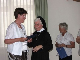 Unter großem Applaus überreichte Generaloberin Sr. Maria Rosalia allen Geehrten ihre Ehrenurkunden und darüber hinaus noch einen Gutschein über ein kostenloses Wochenende am Sonnenhof, einem Kurheim der Barmherzigen Schwestern in Kassel in der Nähe des Herkules. Der Empfang wurde am Klavier von Christian Seidler, einem Schüler des Wigbertgymnasiums in Hünfeld, begleitet.