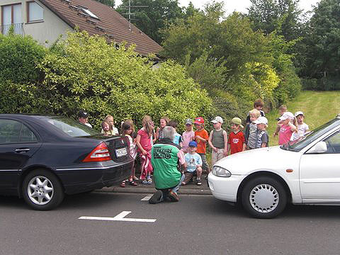 Kurz vor Ende der Kindergartenzeit fand an einem Samstagvormittag dann der Abschlusstest statt. Hier mussten die „Schulkinder“ alleine und selbständig einen festgelegten Parcours bewältigen. Die Eltern standen an den sechs Kontrollstellen und mussten die Kinder absichern und ihr Verhalten auf dem Prüfbogen notieren. Die Kinder überquerten alleine eine Straße, auch zwischen parkenden Autos, sie mussten an einer den Gehweg versperrenden Mülltonne vorbeigehen, eine unübersichtliche Garagenausfahrt passieren und hinter parkenden Autos vorbeigehen. Die Kinder, aber auch manche Eltern, waren aufgeregt, als es morgens um 10 Uhr losging und die Kinder zeigen sollten, was sie schon alles gelernt, aber auch schon wieder vergessen hatten.