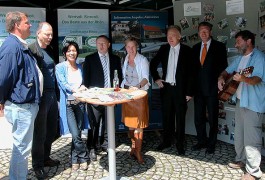 Vor dem Münnerstädter Schloss präsentierte sich die Point-Alpha-Stadt Geisa, die 2011 den 2. Rhöner Wandertag ausrichten wird. Dieser findet am 30. und 31. Juli kommenden Jahres statt. Peter Kling und Eva Pagel aus Geisa übergaben Bürgermeister Helmut Blank einen Wanderrucksack mit Brot und Wurst aus der Rhönstadt. Dieser versprach, selbst nach Geisa zu wandern, um dort am 2. Rhöner Wandertag teilzunehmen.