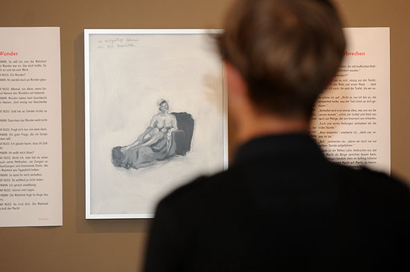 Höhepunkt der Ausstellung ist aber sicherlich das bildnerisch-literarische Großprojekt „Die letztgültigen Wahrheiten“ von Leszek Skurski und Guido Rohm. In 14 Bildern und Texten erzählen uns Skurski und Rohm ihre Version der Lebensgeschichte Merga Biens. In diesem einzigartigen Kunstprojekt verschmelzen sie die Themen Erinnerung, Identität und Wahrheit zu einer Melange Noir. Sie zeigen nicht nur das Leben Merga Biens auf, sondern weisen auf die Tragödie des menschlichen Daseins in seiner Verlorenheit insgesamt hin.
