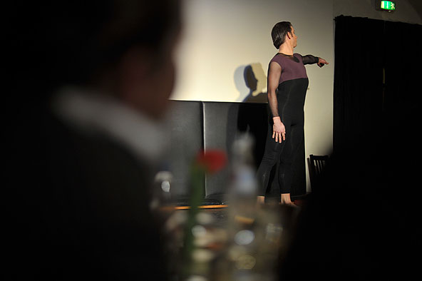 Denn Hönscher und Ortega zeigten auf der kleinen Bühne des Museumskellers vor ausverkauftem Haus, wie man die große Geste selbst auf kleinstem Raum zelebrieren und welchen Reiz ein solches Kammerspiel entfachen kann. Dabei bedienten sich die Tänzer aus der ganzen Welt der Bewegungskunst. Nicht nur klassische Posen konnte man sehen. Auch zeitgenössisches Tanztheater à la Pina Bausch oder John Neumeier war zu entdecken (wie z.B. zu der Musik von Philip Glas). Sogar Elemente der Pantomime und des japanischen Butoh verwendete Hönscher, der in Mannheim studiert hat, in seiner Choreographie. Eindrucksvoll wie sich die Tänzer zu dem experimentellen Stück Emerê von dem brasilianischen Musiker Tom Zé in tierartige Wesen verwandelten, die sich vorsichtig aber auch bedrohlich, langsam aber auch ruckartig über den Bühnenboden bewegten.