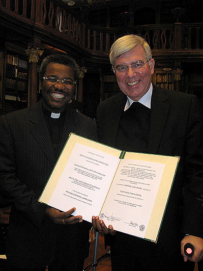 Im Rahmen der akademischen Veranstaltung fand noch eine weitere Promotion statt: Pfarrer Michel Marc Mvomo (38) aus dem Bistum Mbalmayo (Kamerun), der von 2002 bis 2010 in Fulda studierte und in der Seelsorge aushalf, wurde mit einer Arbeit über Pastoral in Afrika bei Prof. Dr. Richard Hartmann zum Dr. theol. promoviert.